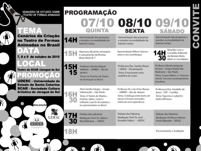 É com alegria e saudações que convidamos a todos a participarem do 7º Seminário de Estudos sobre Teatro de Formas Animadas em Jaraguá do Sul nos dias 07 a 09 de outubro de 2010!