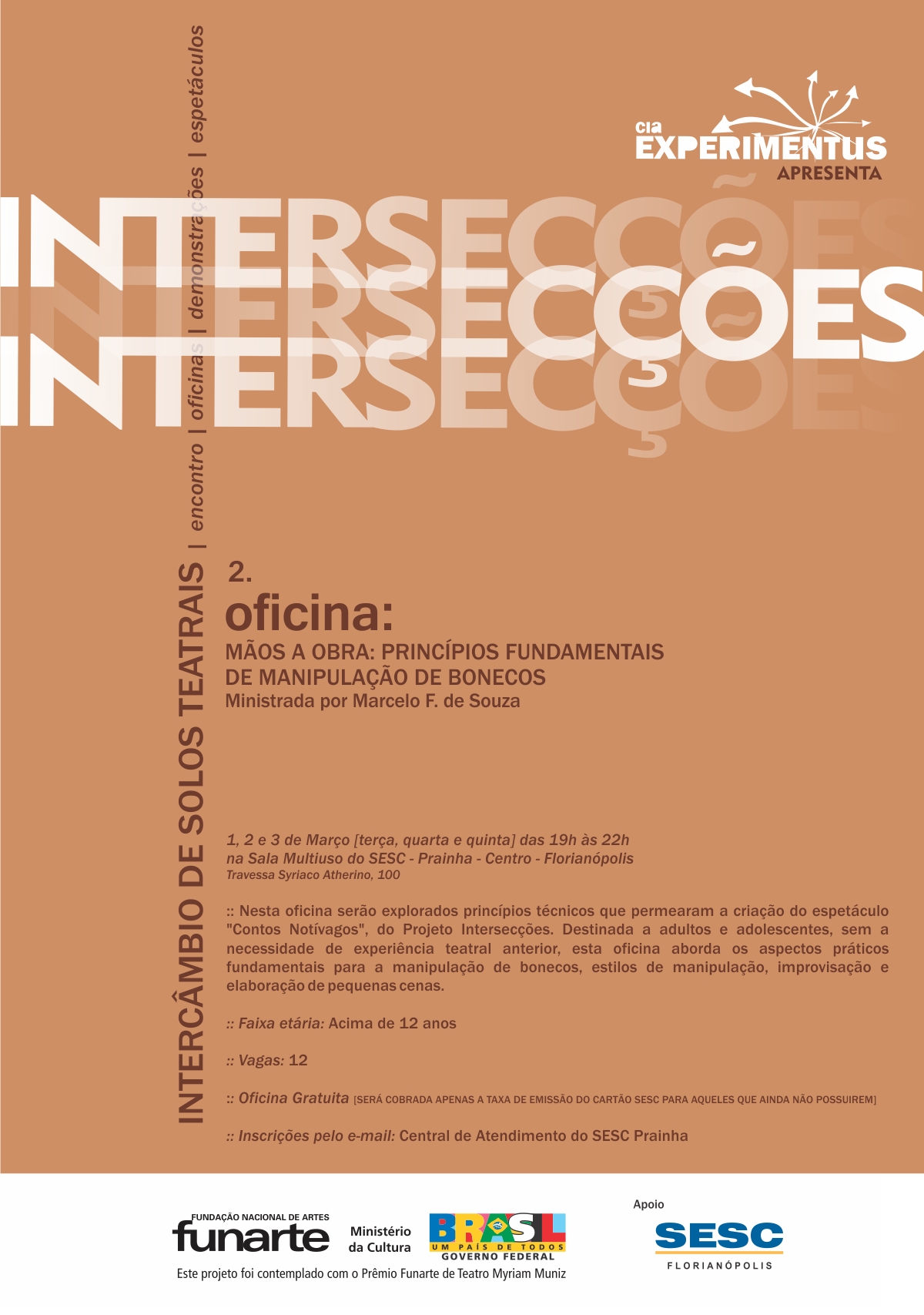 :: Quando e Onde: Dias 1, 2 e 3 de Março [ter / qua / qui] na Sala Multiuso do SESC – Prainha – Florianópolis,das 19 às 22h.