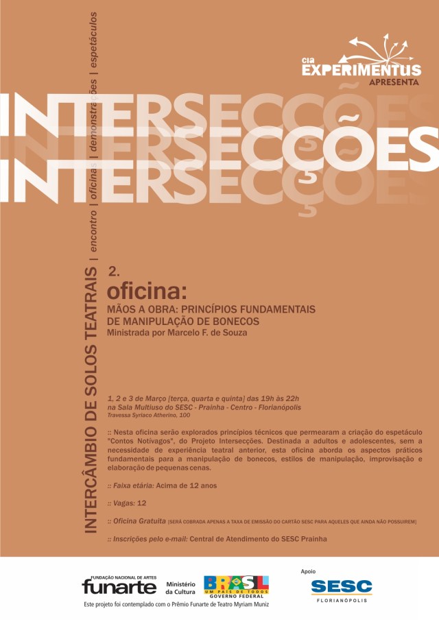 :: O trabalho: Serão explorados nesta oficinas princípios técnicos que permearam a criação do espetáculo “Contos Notívagos”, do Projeto Intersecções. Destinada a adultos e adolescentes, sem a necessidade de experiência teatral anterior, esta oficina aborda os aspectos práticos fundamentais para a manipulação de bonecos, estilos de manipulação, improvisação e elaboração de pequenas cenas.]