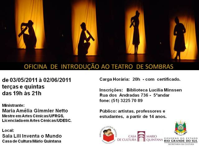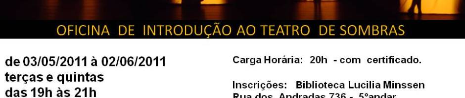 A oficina visa proporcionar a utilização de recursos do Teatro de Sombras, como o uso de focos luminosos, telas e silhuetas, para construir um conhecimento básico sobre a linguagem da animação de formas. Também visa estimular a criação de imagens e de dramaturgias que surjam com a prática e o manuseio da luz e da sombra, bem como, a criação de jogos corporais projetados na tela. Os encontros serão divididos em três etapas: “Descoberta da Linguagem”, “Experimentação de Focos, Telas e Silhuetas” e “Criação de Cenas usando o corpo como silhueta”. Haverá uma apresentação do resultado e será fornecido certificado de participação.
