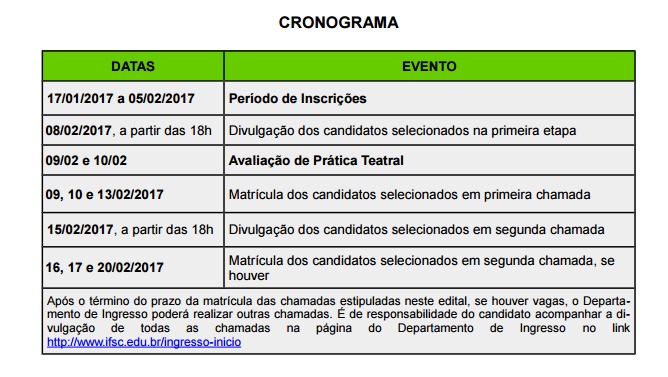 As inscrições acontecerão de 17/01 a 05/02/2017, exclusivamente pelo endereço http://www.ifsc.edu.br/ingresso-inicio