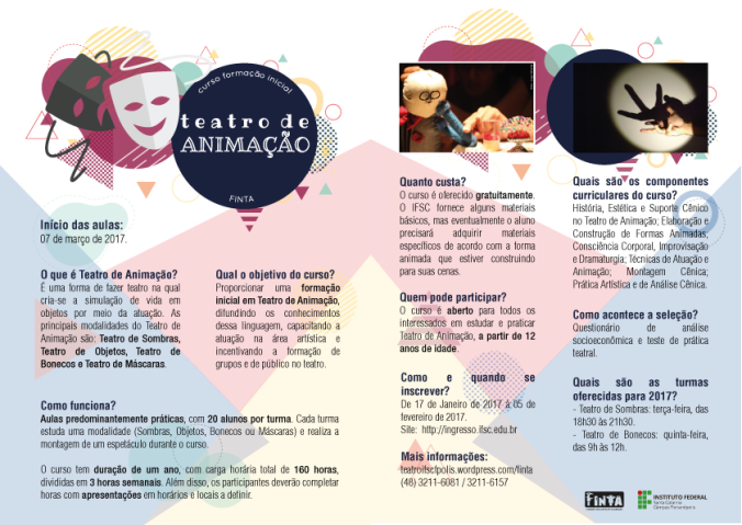 FINTA 2017Pra quem quer ter uma formação inicial em Teatro de Animação!! Oportunidade linda!!Edital para o Curso de Formação Inicial em Teatro de Animação no IFSC – Campus Florianópolis!