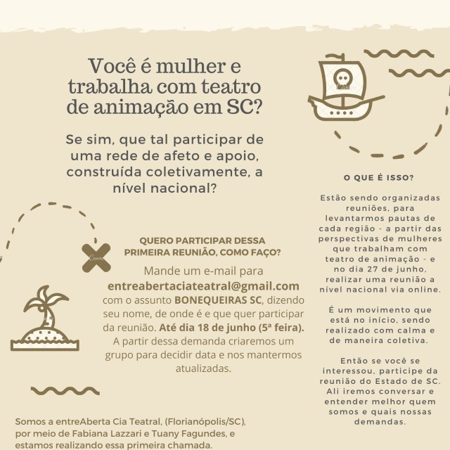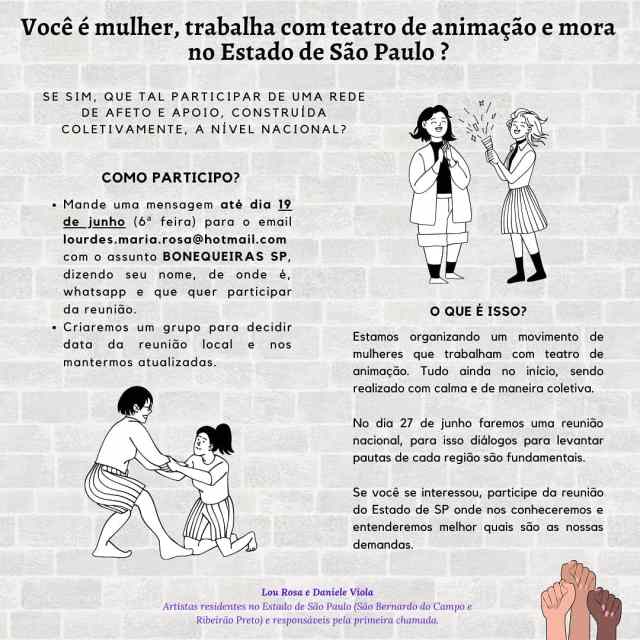 A mulheres que trabalham com Teatro de Animação estão criando uma rede de afeto, apoio construída coletivamente de forma colaborativa. Seguem alguns flyers de organizações estaduais para um primeiro contato. Estão todas convidadas!