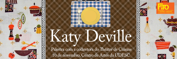 No dia 10 de novembro, a Professora Katy Deville, referência em Teatro de Objetos e Codiretora do Théâtre de Cuisine (França) vai proferir palestra às 19h00, no Espaço 2 do Bloco de Artes Cênicas do CEART. Segundo os organizadores, o evento “é IMPERDÍVEL PARA QUEM GOSTA OU TRABALHA COM TEATRO CONTEMPORÂNEO”. Katy Deville é da primeira geração do teatro de objeto. Através da sua arte, revisita a história, seus mitos e suas lendas e constroe, a partir de objetos manufaturados e reconhecíveis por todos, hipóteses de vida.Sobre KATY DEVILLE
